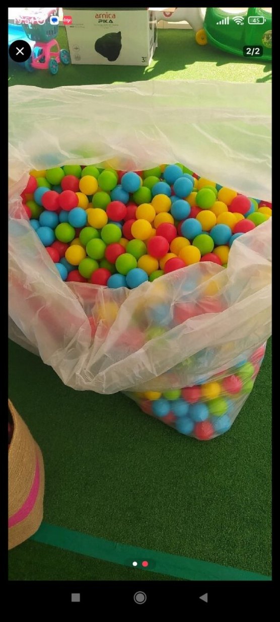 Kırmızı, sarı, yeşil ve mavi renklerde çok sayıda plastik top içeren büyük bir torba.