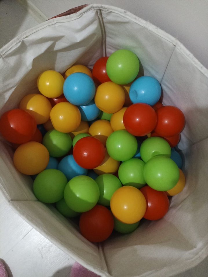 Kırmızı, yeşil, mavi ve sarı renkli plastik toplardan oluşan oyun topu sepeti. 75 adettir daha da fazla olur hatta küçükleri saymadık