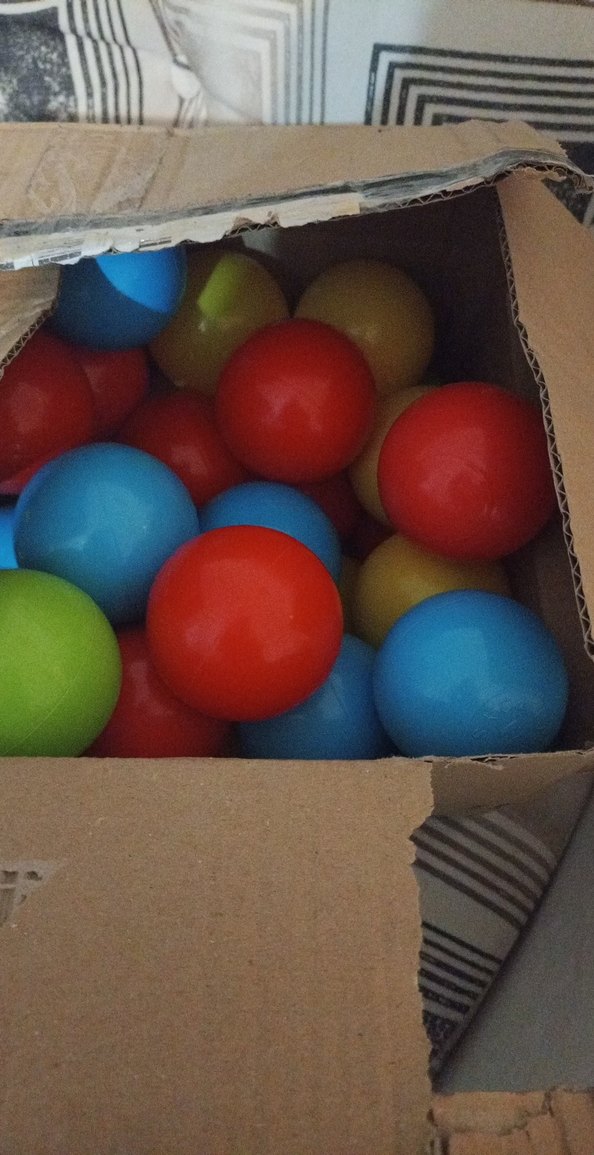 Çeşitli parlak renklerde plastikten yapılmış renkli oyun topları seti. Karton kutuda saklanmaktadır.