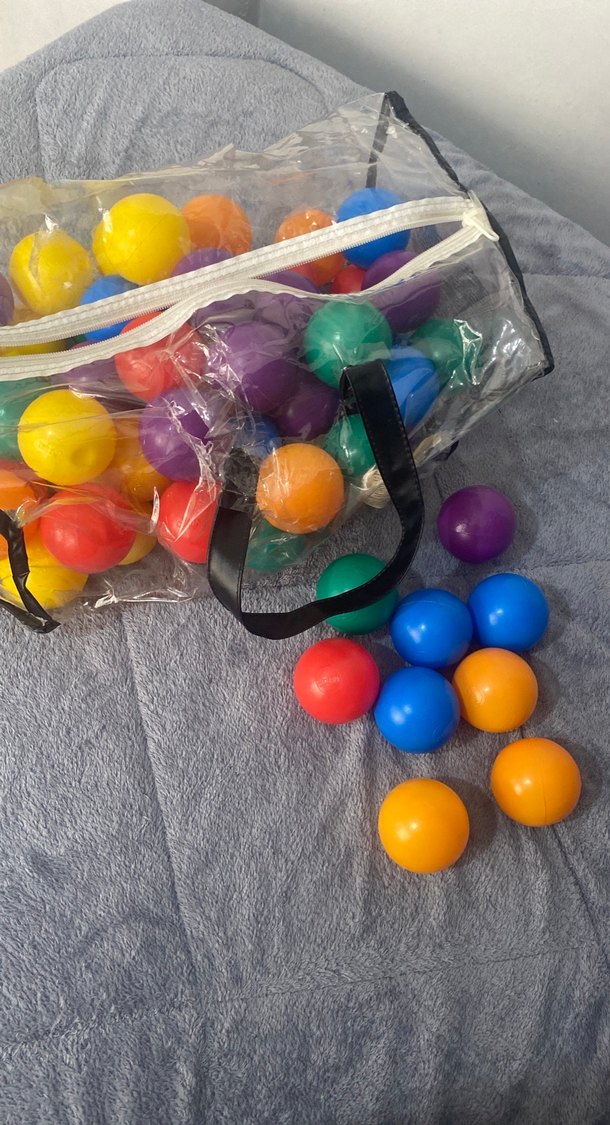 Siyah saplı şeffaf çantada renkli plastik toplar seti. Sarı, turuncu, mor, mavi, kırmızı ve yeşil renklerde çeşitli toplar bulunur. Toplam 65 adet