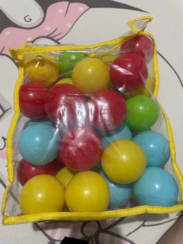 Şeffaf, sarı kenarlıklı file çantada çok renkli plastik oyun topları seti.