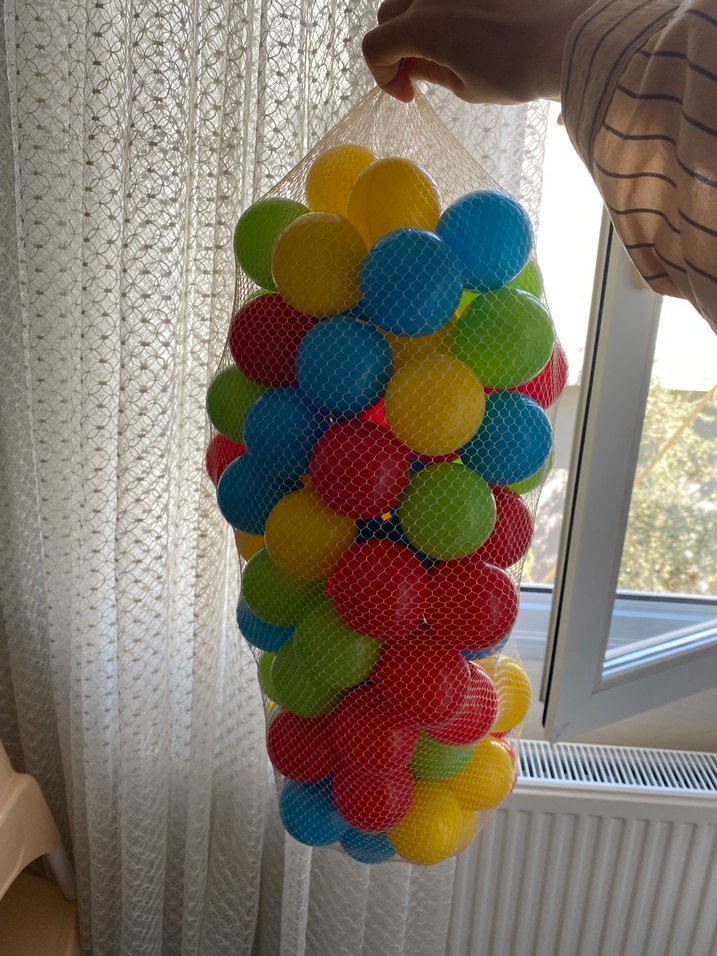 Çocukların oyun alanları için renkli plastik oyun topları seti, file torbada saklanır. 95-100adet arası mevcut