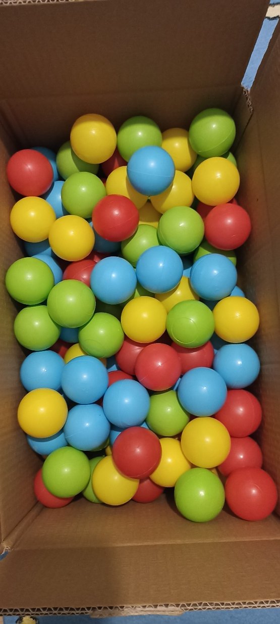 Kırmızı, sarı, yeşil ve mavi renklerde oyun ve duyusal aktiviteler için renkli toplar seti . 205 adet.