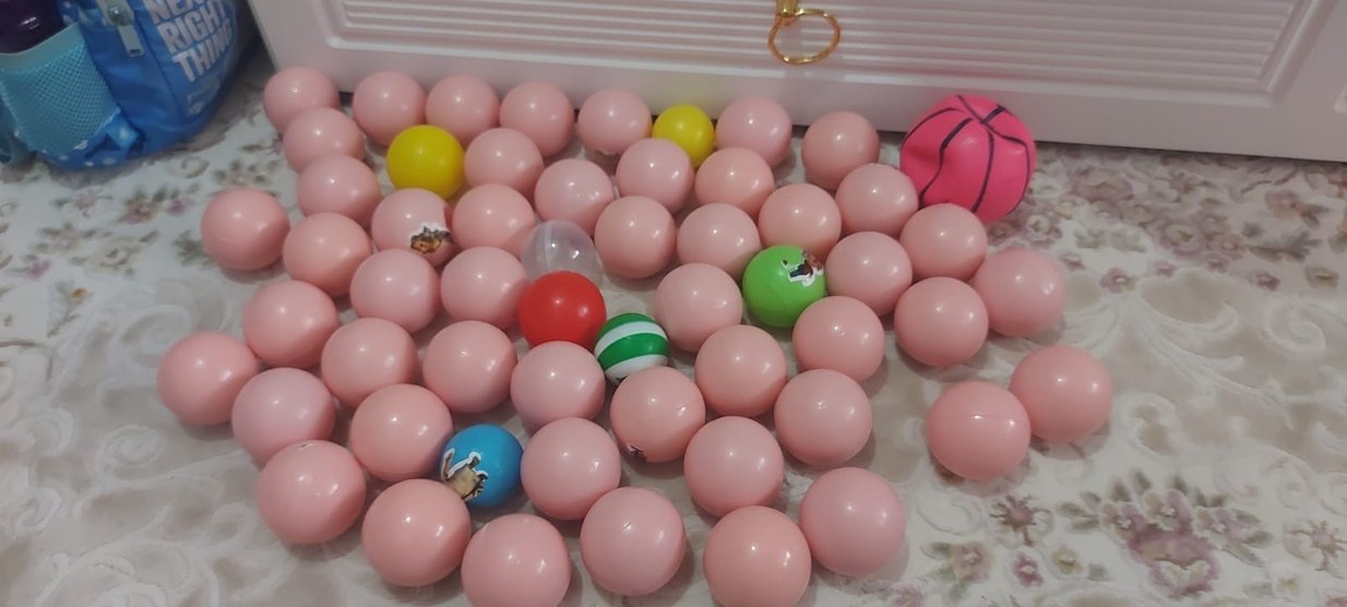 Pembe, yeşil, sarı, kırmızı, mavi ve çizgili renkli plastik oyun toplarından oluşan set. Adet 55