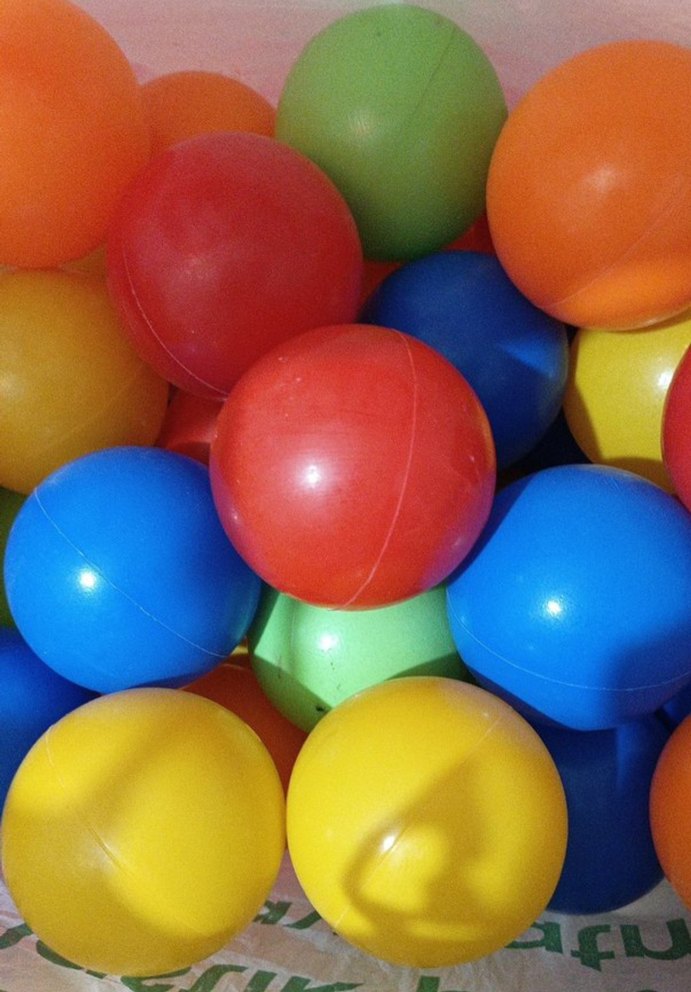 Çeşitli parlak renklere sahip renkli plastik oyun topları seti.