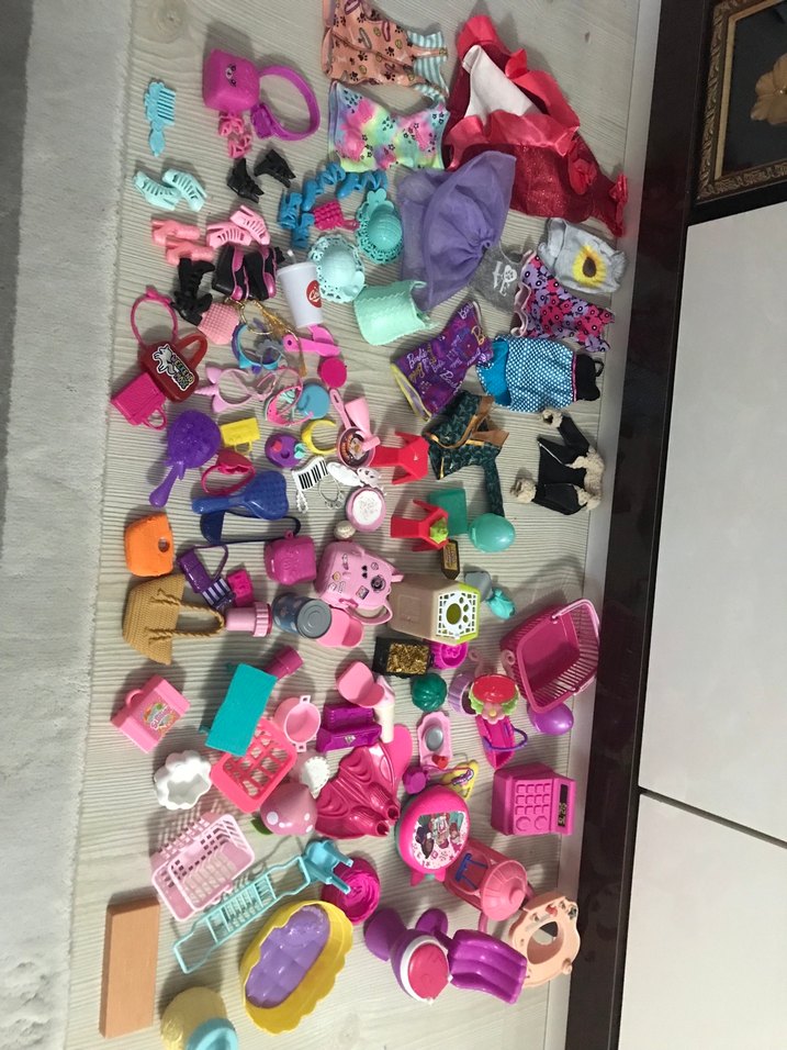 Çeşitli renklerde ve pembe temalı oyuncak kıyafetler, ayakkabılar ve küçük aksesuarlar içeren renkli oyuncak seti.