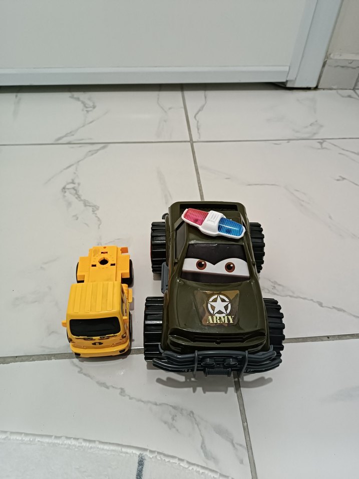 Renkli oyuncak araba seti, sarı bir araç ve üzerinde polis ışığı ve ifadeli gözleri olan ordu yeşili araba içerir.