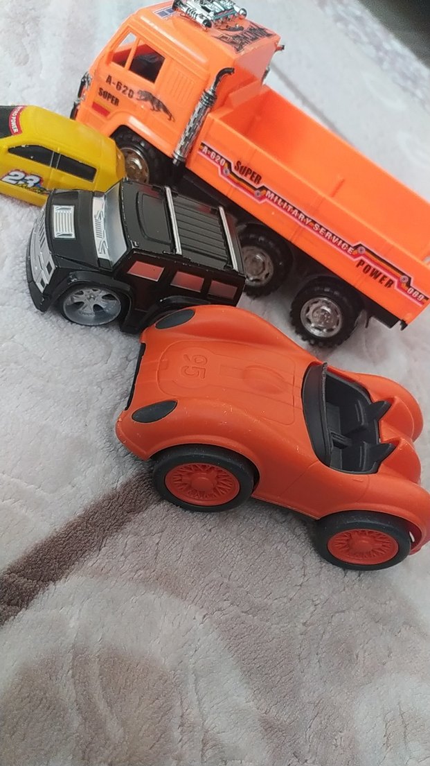 Turuncu spor araba, siyah SUV, sarı araba ve turuncu kamyonet içeren renkli oyuncak araba seti. Her araç canlı renklere ve detaylı tasarıma sahip.