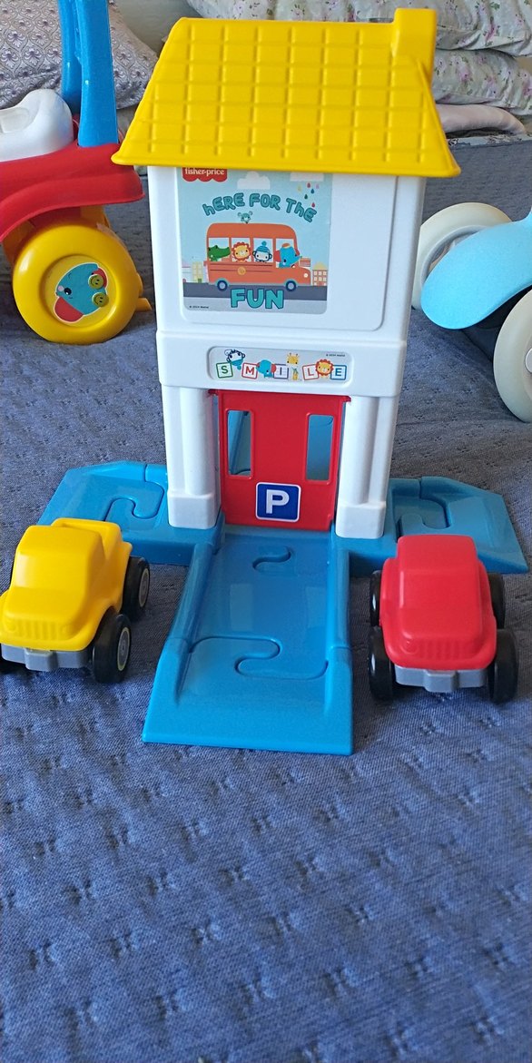 Renkli oyuncak arabalar ve rampalı park yeri seti. Sarı ve kırmızı arabalar, eğlenceli detaylarla birlikte. Fisher Price araba