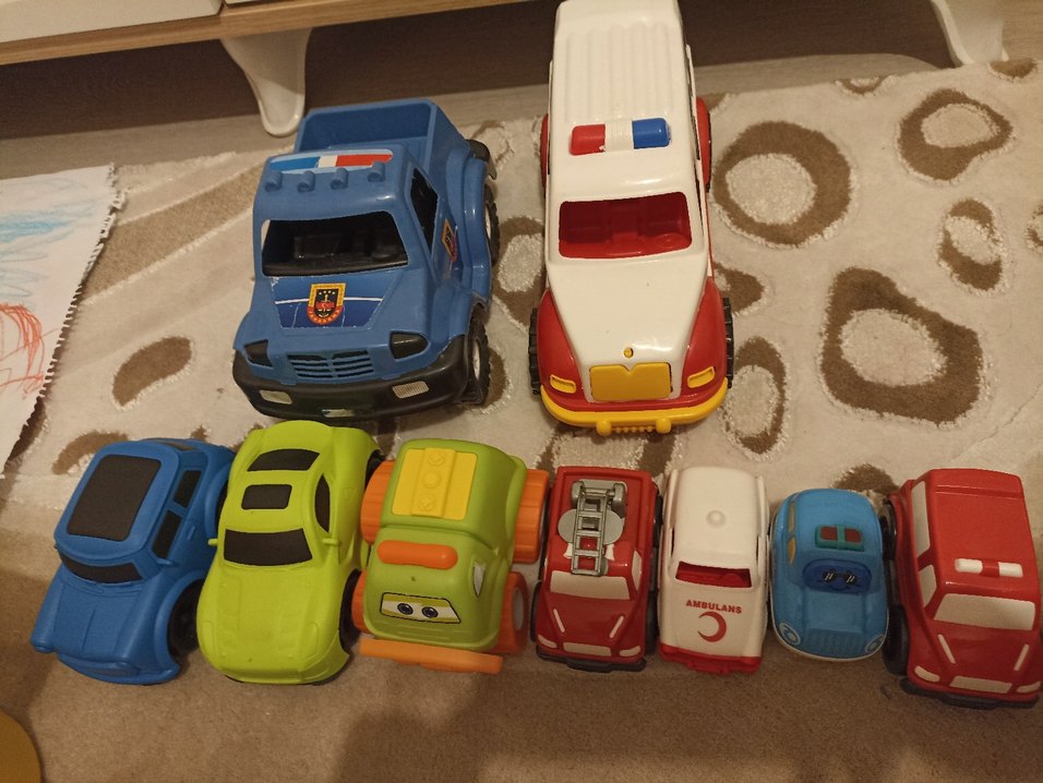 Polis, ambulans, itfaiye ve çeşitli araçlardan oluşan renkli oyuncak araba seti. Hayal gücünü destekler.