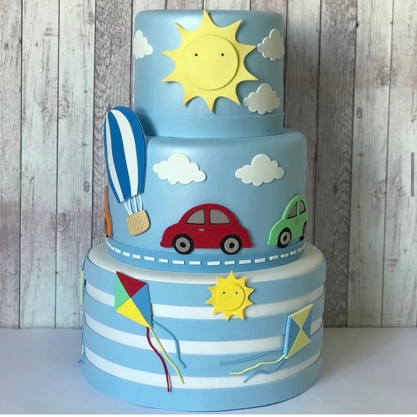 Oyuncak araba, uçurtmalar, sıcak hava balonları ve bulut desenleriyle süslenmiş, mavi beyaz çizgili renkli pasta ☀️.