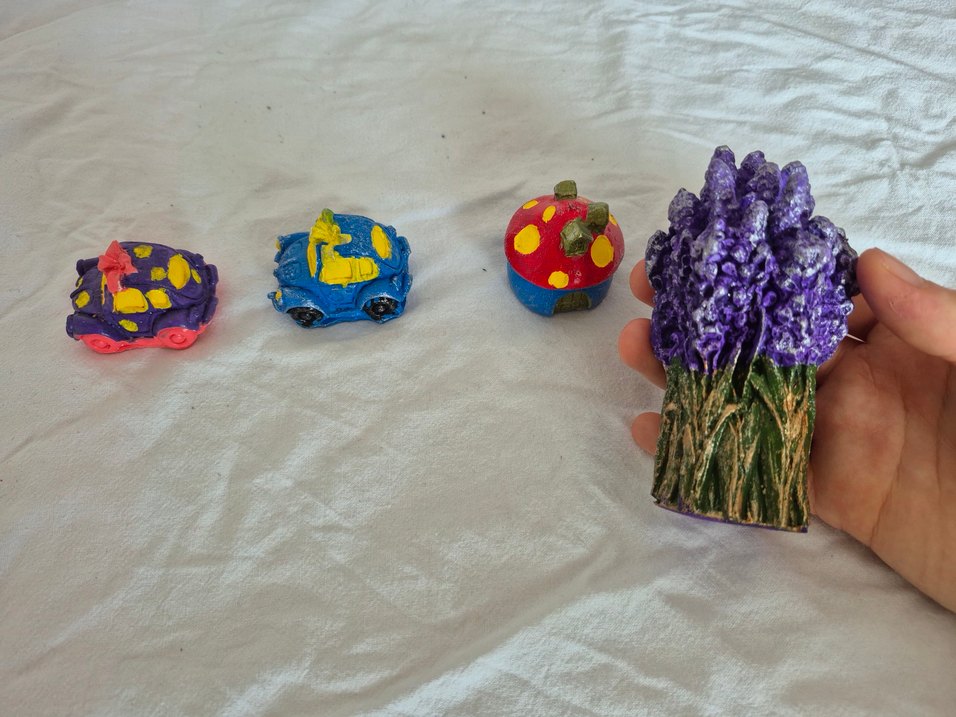 Mavi-sarı araba, kırmızı-mavi sarı benekli uğurböceği ve mor lavanta demeti figürlerinden oluşan renkli küçük oyuncaklar. Araba,ev figürleri 15 tl lavanta 75 tl dir.
