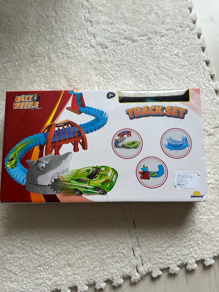 Kavisli mavi parkur ve köpekbalığı temalı fırlatıcı içeren renkli oyuncak araba seti.