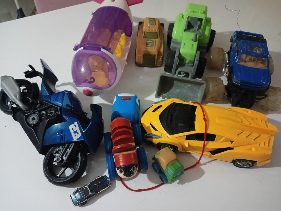 Helikopter, inşaat araçları, arabalar ve motosiklet içeren renkli oyuncak araç seti. Farklı boyutlar ve canlı renkler oyunu eğlenceli kılar.