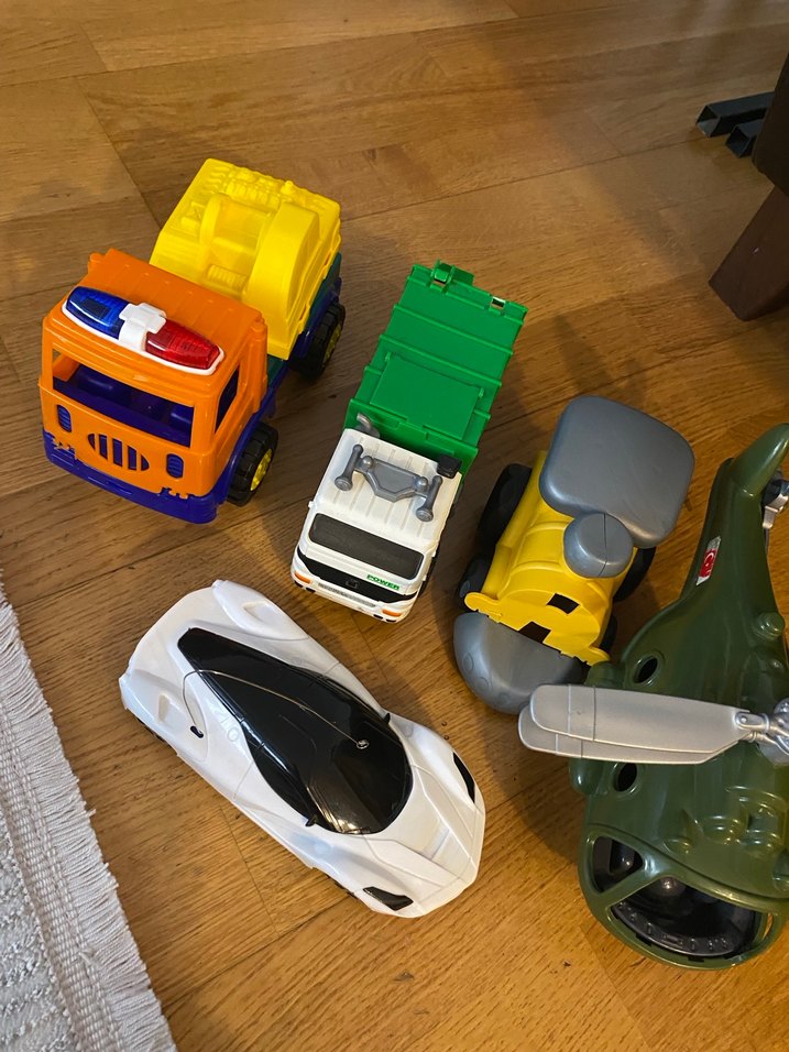 Beyaz spor araba, sarı iş makinesi, yeşil kamyon ve çok renkli polis kamyonu içeren renkli oyuncak arabalar seti. Dayanıklı plastikten yapılmıştır.
