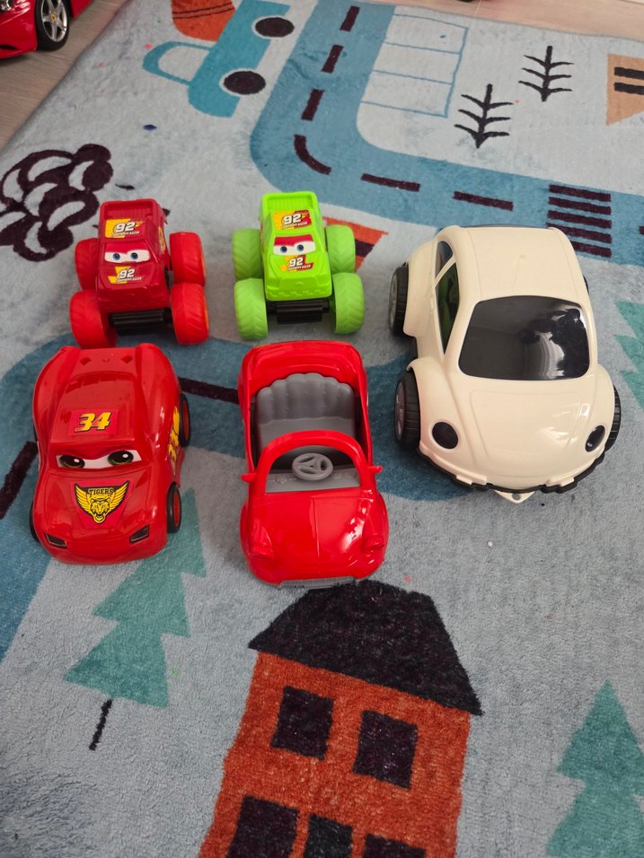 Çeşitli tasarımlarda kırmızı, yeşil ve beyaz renkli oyuncak arabalar seti. Hayal gücünü destekler.