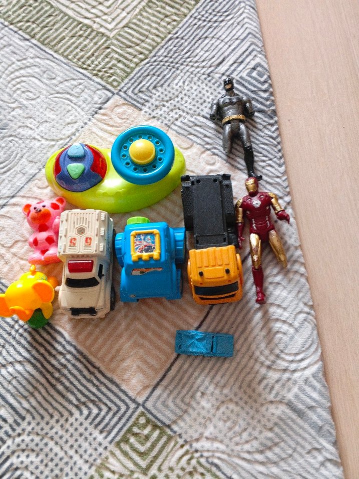 Çeşitli şekil ve boyutlarda renkli oyuncak arabalar ve süper kahraman figürleri seti. Hayal gücünü destekler.