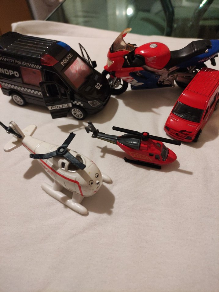 Renkli oyuncak araç seti içinde kırmızı motosiklet, kırmızı van, siyah polis minibüsü, beyaz ve kırmızı helikopter bulunur.