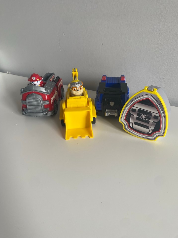 İtfaiye aracı, kepçe ve karakter figürlü çeşitli renkli oyuncak araçlar seti. Canlı sarı ve kırmızı renkler dikkat çekiyor.