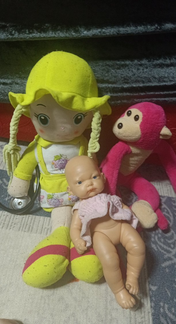 Sarı şapkalı renkli bir oyuncak bebek, pembe peluş maymun ve küçük pembe kıyafetli bebekten oluşan set.