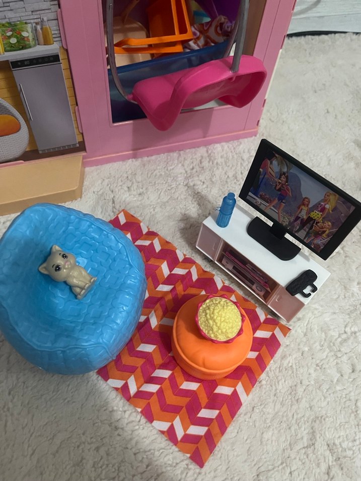 Mavi dokulu puf, küçük turuncu oturma alanı, oyuncak televizyon sehpası ve desenli halı içeren renkli oyuncak oturma odası seti. Küçük oyuncak köpek ve aksesuarlar bulunur.