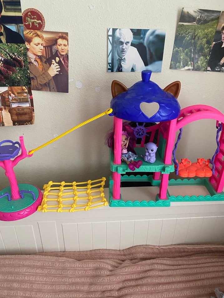 Mor çatılı, hayvan kulaklı, sarı ağ köprülü ve küçük oyuncak figürlü renkli oyuncak ev.