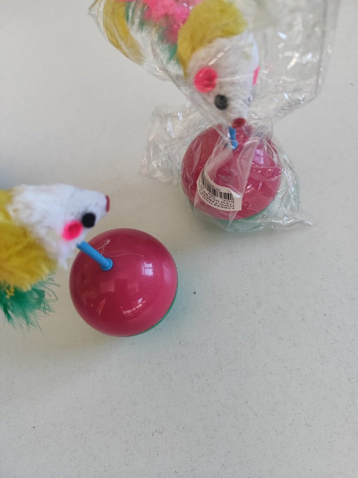 Renkli tüylü oyuncak fare, pembe topa bağlıdır ve eğlenceli oyun için uygundur.