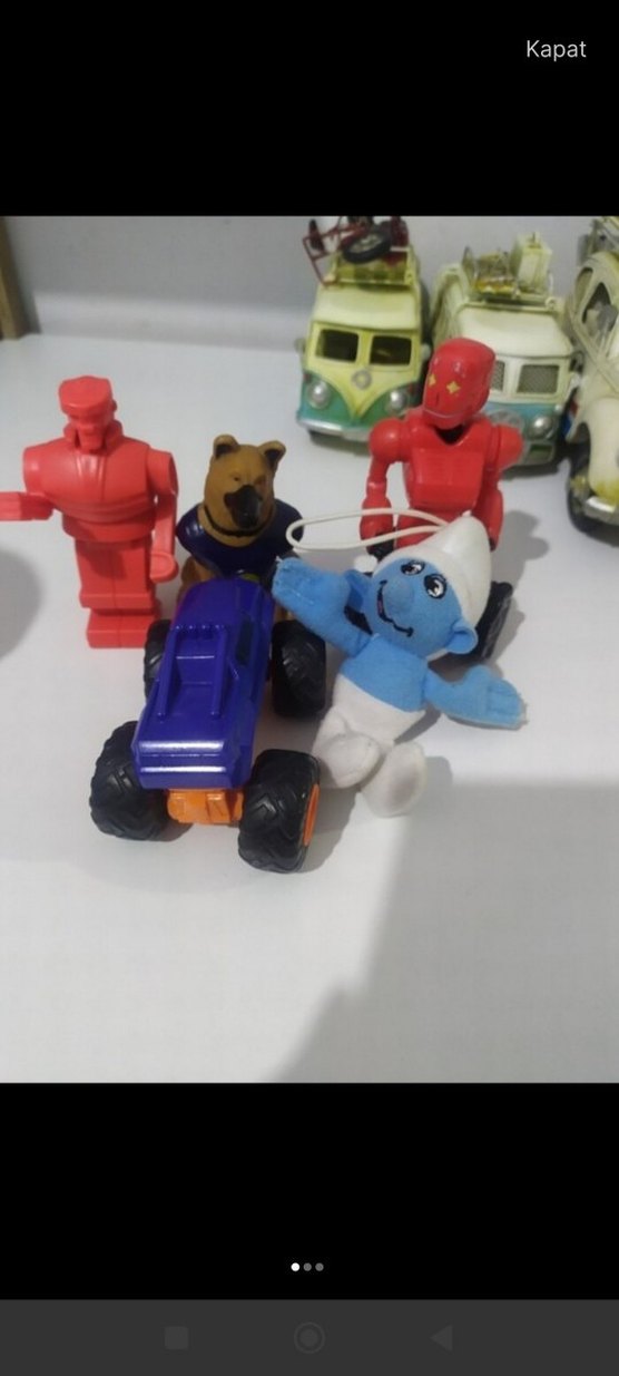 Mavi oyuncak traktör, kırmızı robotlar, köpek ve mavi Şirin figürleri içeren renkli oyuncak seti. Canlı renkler ve farklı şekiller bulunur. Fiyata hepsi dahildir.