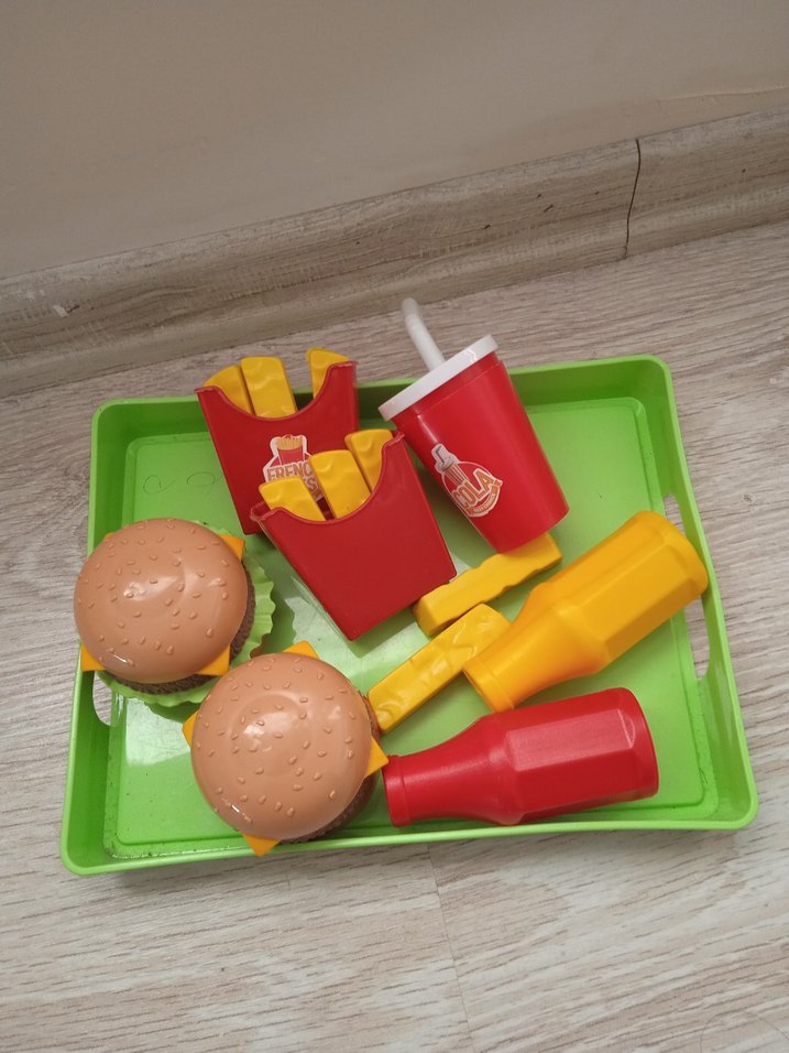 İki hamburger, patates kızartması, içecek bardağı ve sos şişeleri içeren renkli oyuncak seti, yeşil tepsi üzerinde.,eksiği var mı bilmiyorum posetden cikarttigimla duruyor