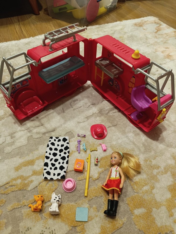 Canlı kırmızı renkte itfaiye aracı oyuncak seti, bebek, iki küçük hayvan figürü ve çeşitli aksesuarlar içerir. Araç açılarak detaylı iç mekanlar ve merdivenler sunar.