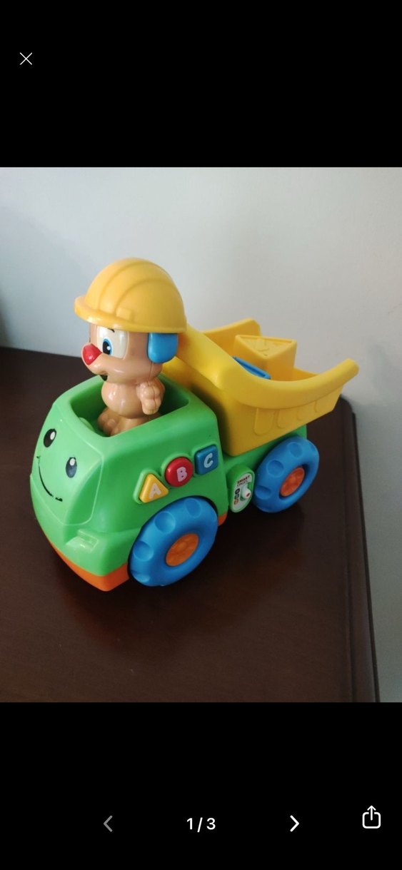 Gülen yüzlü renkli oyuncak kamyon, sarı kasklı küçük figür ve yan tarafında ABC düğmeleri bulunur. Mavi tekerleklidir.