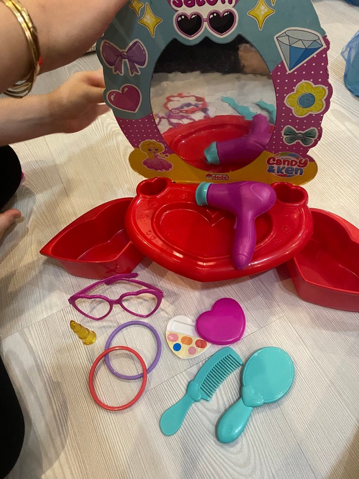 Renkli oyuncak makyaj ve saç seti; ayna, saç kurutma makinesi, tarak, fırça, gözlük, saç tokası ve makyaj paleti içerir.