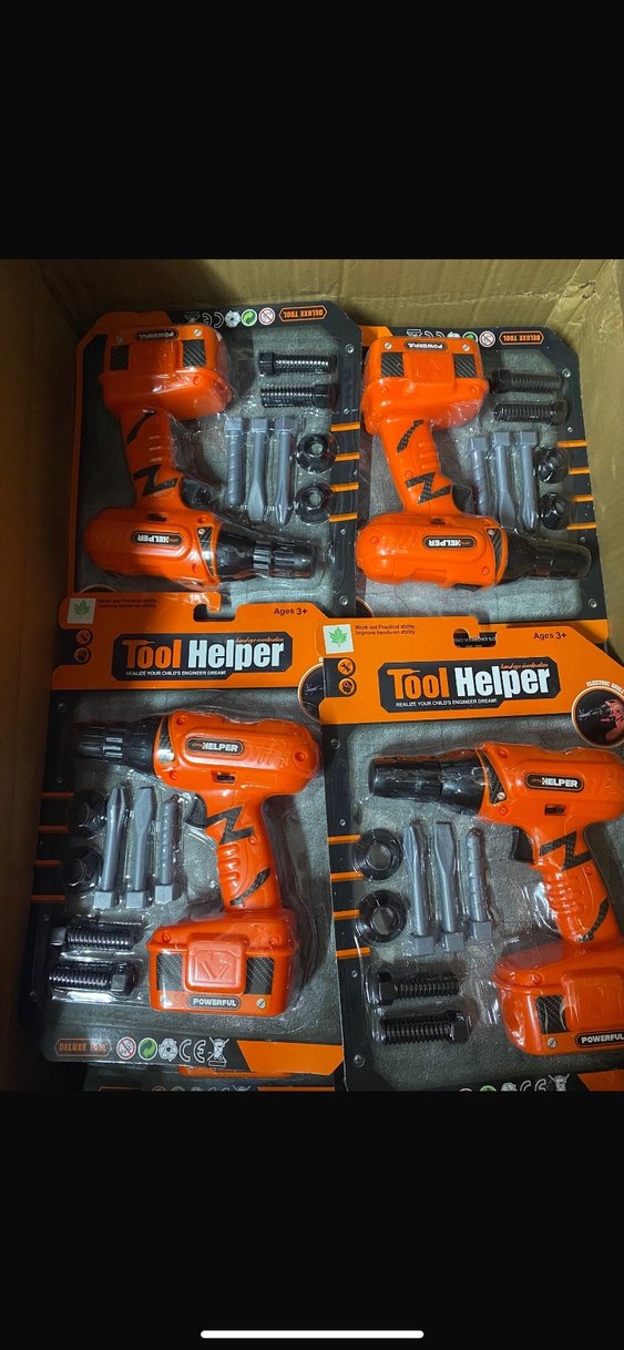Çocuklar için çeşitli çıkarılabilir parçalara sahip renkli eğitim amaçlı oyuncak matkap seti. Üzerinde 'Helper' yazısı bulunur.