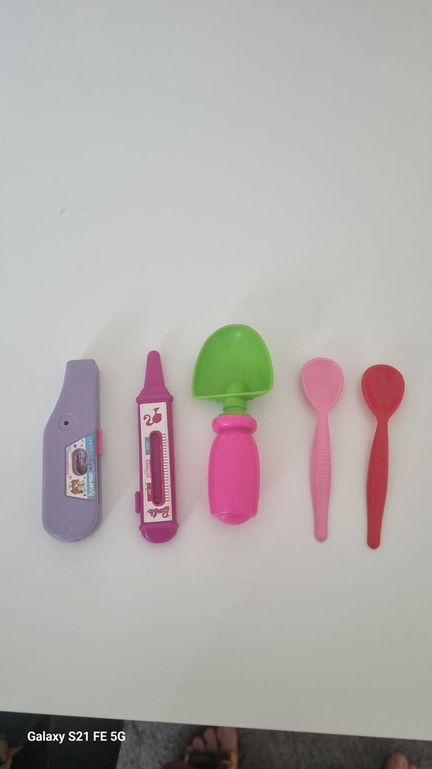Renkli oyuncak seti, termometre, pembe saplı yeşil kepçe ve pembe ile kırmızı tonlarında üç kaşık içerir.