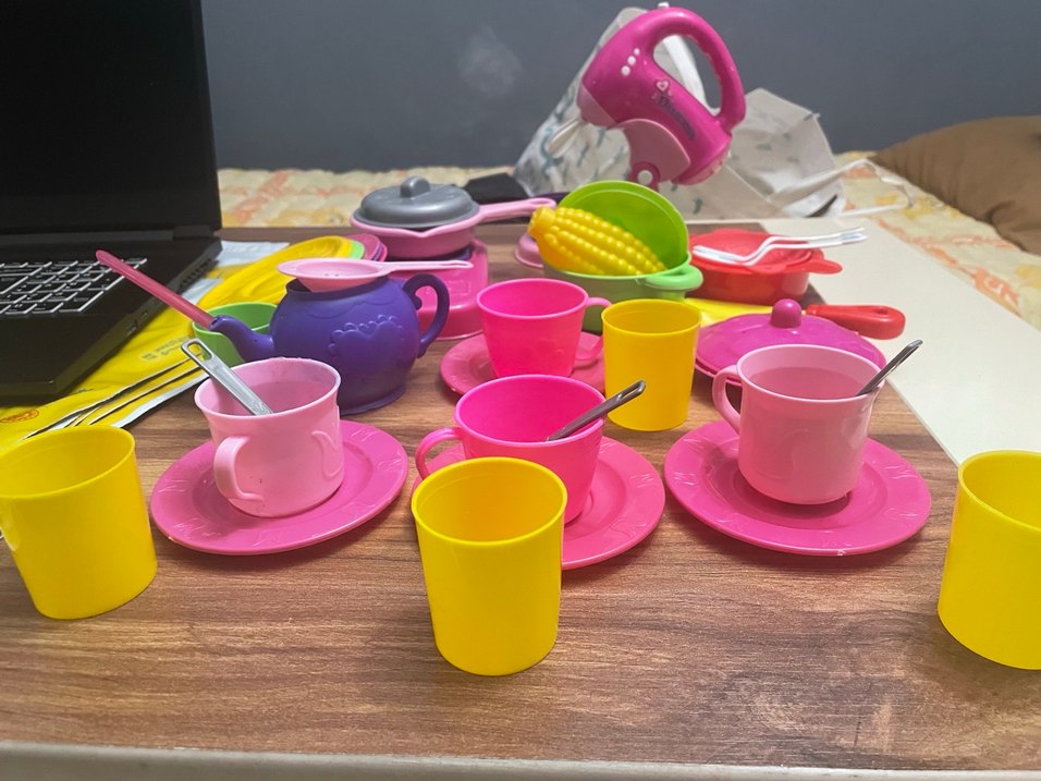 Pembe, sarı ve mor renklerde fincanlar, tabaklar, çaydanlık ve mutfak gereçleri içeren renkli oyuncak mutfak seti. ️