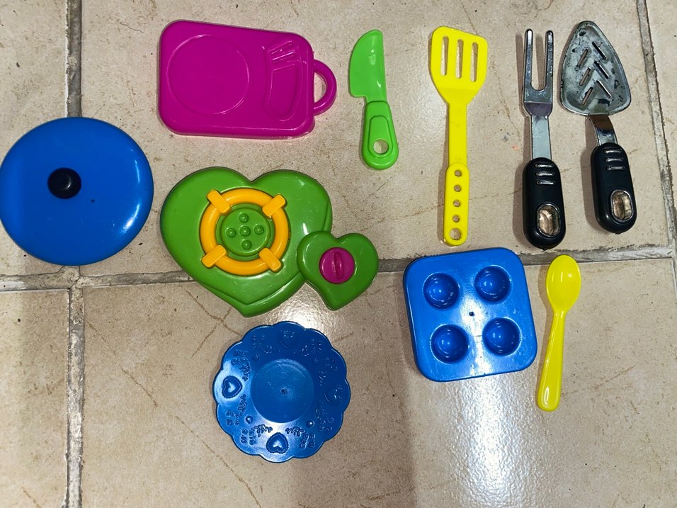 Renkli oyuncak mutfak seti; tepsi, bıçak, spatula, ocak ve tabaklar içerir.