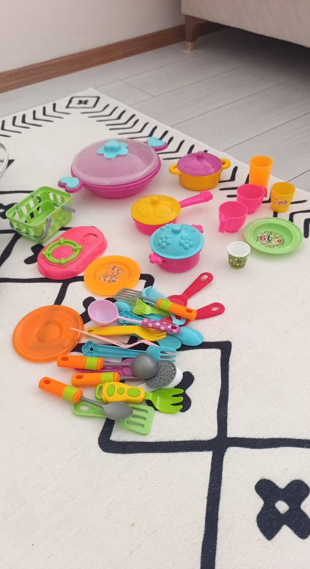 Renkli oyuncak mutfak seti, tencere, tava, mutfak gereçleri ve bardaklar içerir. Çocuklar için eğlenceli ve canlı parçalarla dolu.