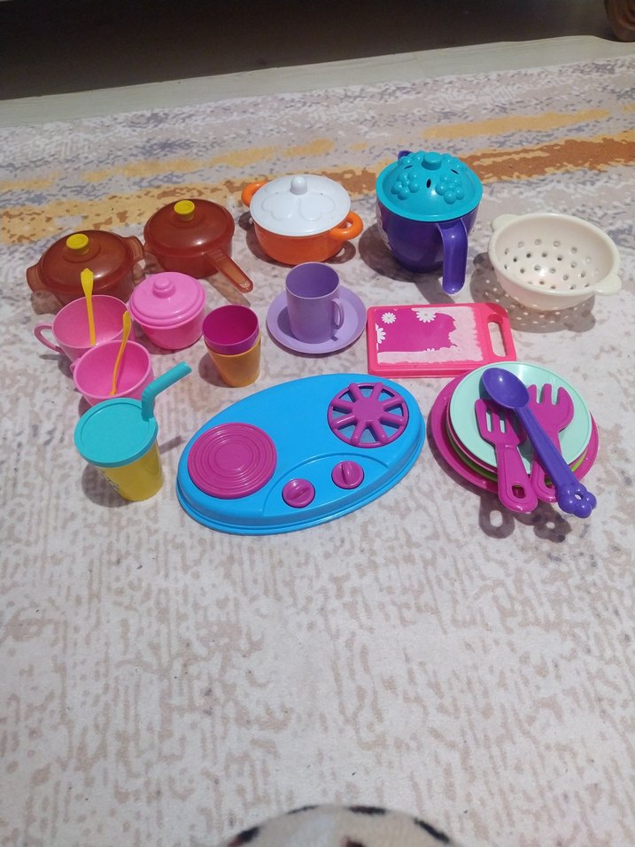Renkli oyuncak mutfak seti, tencere, tava, bardak, tabak, çatal-kaşık ve ocak içerir. Canlı renklerle hayal gücünü destekler. ️