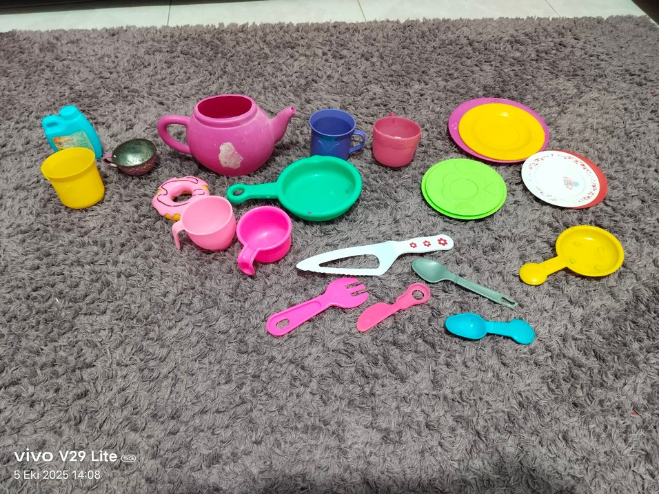 Renkli oyuncak mutfak seti; pembe çaydanlık, bardaklar, tabaklar, tava ve mutfak gereçleri içerir. ️