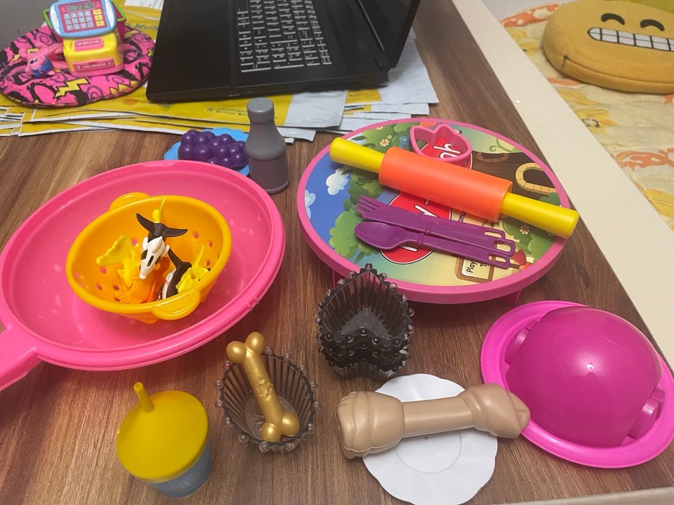 Renkli oyuncak tabaklar, çatal-kaşık, merdane, oyuncak üzüm ve diğer mutfak eşyalarını içeren oyuncak mutfak seti. ️