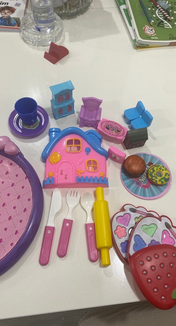 Pembe ev, minyatür mobilyalar, çatal-kaşık-bıçak ve oyun yiyecekleri içeren renkli oyuncak mutfak seti. ️