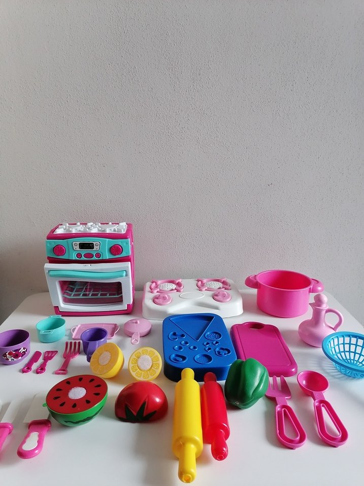 Pembe ve renkli tonlarda oyuncak fırın, ocak, tencere, mutfak gereçleri ve oyuncak yiyeceklerden oluşan renkli bir mutfak seti.