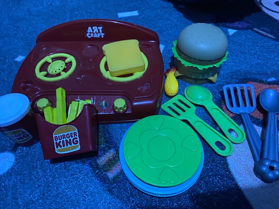 Renkli oyuncak mutfak seti, kahverengi ocak, yeşil mutfak gereçleri ve oyuncak hamburger içerir. Oyuncak burger köftesi ve küçük mısır parçaları da mevcuttur.