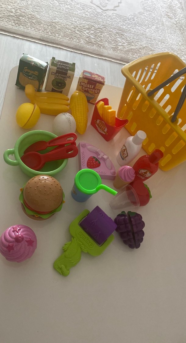 Çeşitli yiyecekler ve sarı alışveriş sepeti içeren renkli oyuncak mutfak seti. Kaşık, içecek, meyve ve atıştırmalıklar içerir.