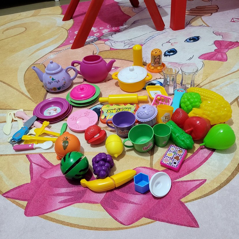 Çaydanlıklar, bardaklar, tabaklar, meyve ve sebzelerden oluşan renkli oyuncak mutfak seti.