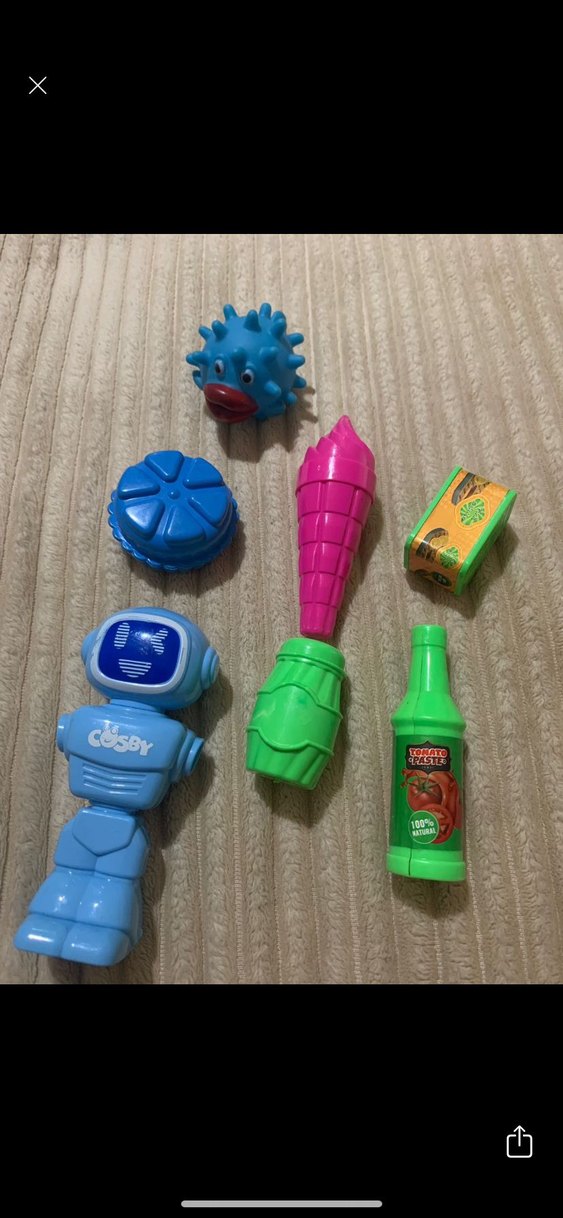 Robot, dondurma külahı ve şişe gibi çeşitli şekillerde renkli oyuncak seti. Canlı ve eğlenceli tasarımlar.