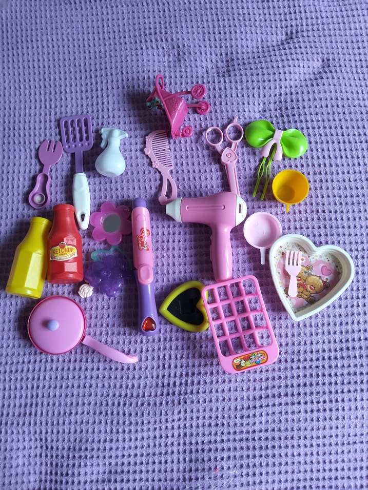 Çeşitli mutfak gereçleri, saç kurutma makinesi ve makas içeren renkli oyuncak mutfak seti. Hayal gücünü destekler.