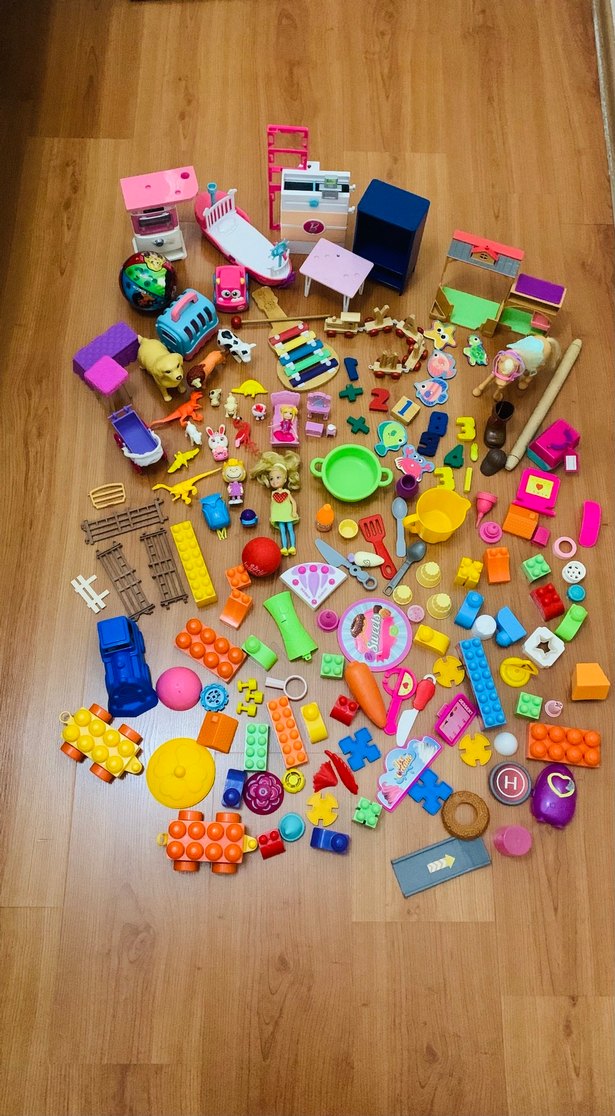 Renkli oyuncak seti, bebekler, hayvan figürleri, mobilya ve aksesuarlar içerir. Hayal gücünü destekler.