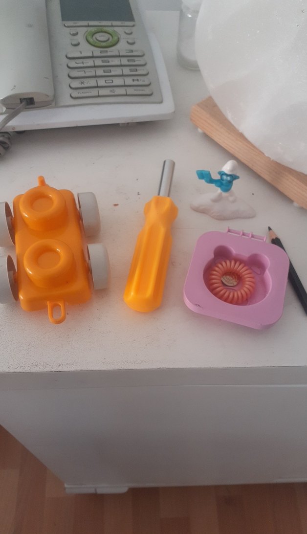 Pembe kalıp, turuncu oyuncak araba, sarı tornavida ve küçük mavi figürden oluşan renkli oyuncak seti.