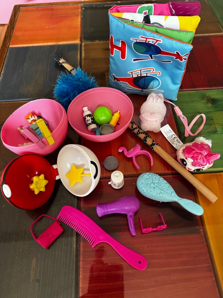 Renkli kumaş kitap, küçük aksesuarlar, oyuncak saç fırçaları ve minyatür kaplar içeren oyuncak seti. Canlı pembe ve mavi renkler öne çıkıyor.